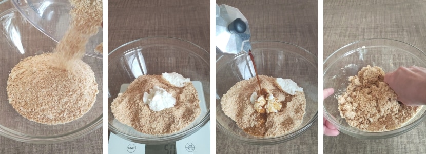 – Réduire les biscuits en poudre avec un mixeur et les verser dans un bol; ajouter le yaourt, le café (non sucré) et mélanger.