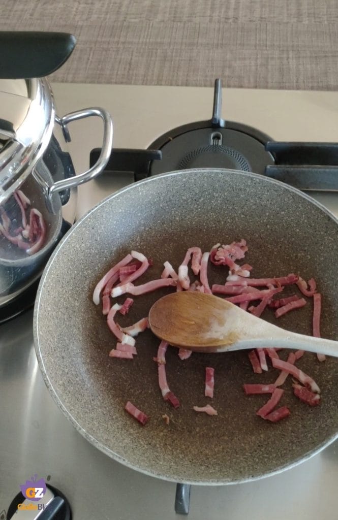 – À part, chauffer la poêle, sans ajouter de matières grasses et rôtir le speck ou bien les lardons en dés.