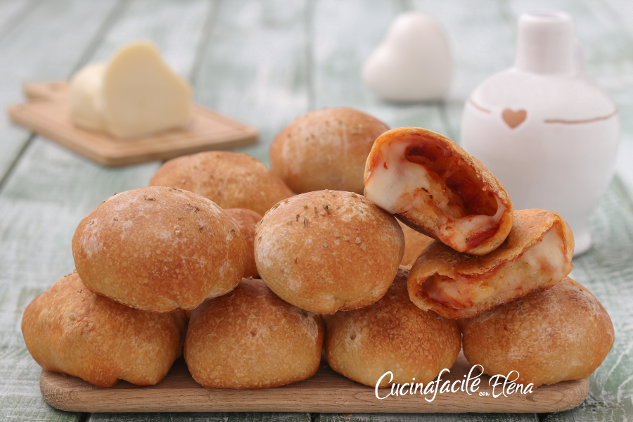 Disposez les bombettes de pizza sur une plaque, badigeonnez-les avec une émulsion réalisée en mélangeant de l’eau et de l’huile, mettez un peu d’origan sur le dessus et faites-les cuire dans un four préchauffé à 180 degrés pendant environ 20 minutes, elles doivent être dorées.