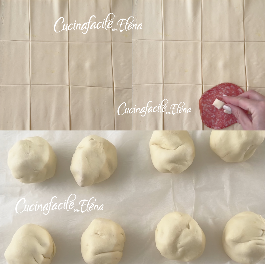 Garnissez chaque petit morceau de pâte feuilletée avec une tranche de salami et quelques morceaux de fromage, fermez et formez des petites boules.