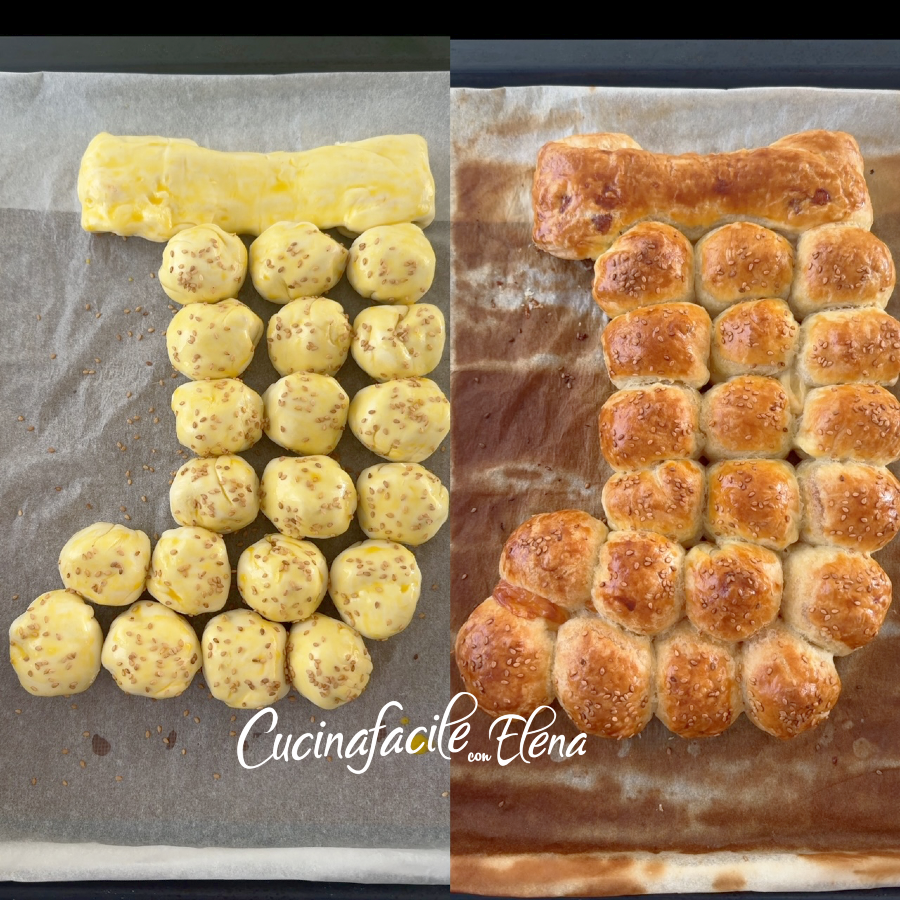 Badigeonnez la surface de la chaussette de la Befana salée avec un peu d’œuf battu, ajoutez quelques graines de sésame seulement sur les boules et faites-la cuire au four préchauffé à 200 degrés pendant environ 30 minutes, elle doit être bien dorée.