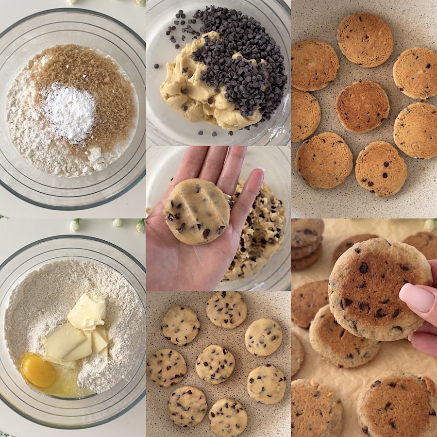 Les cookies à la poêle sont super faciles et rapides à préparer, pour commencer, mettez dans un bol la farine, le sucre semoule et celui de canne, la levure, une pincée de sel et mélangez. Ajoutez la vanille, le beurre à température ambiante, l’œuf et formez une pâte douce et homogène, incorporez ensuite les pépites de chocolat noir.