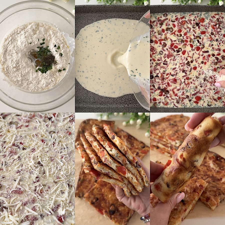 La crêpe pizza est une recette très rapide et maline, comme le dit le nom même, un croisement entre une pizza riche et savoureuse et des crêpes moelleuses. J’ai vu cette recette dans plusieurs vidéos sur des chaînes Instagram étrangères (et évidemment garnie avec des ingrédients pas vraiment italiens et appétissants), donc j’ai voulu l’essayer, et je dois vous dire que c’est vraiment bon! La crêpe pizza est une recette maline sans pâte, pas parce qu’il n’y a pas de pâte, évidemment, mais parce qu’il ne s’agit pas de la pâte classique pour pizza. On la fait en 2 minutes avec un fouet à main et c’est sans levure, donc pas besoin de laisser reposer quoi que ce soit, vous pouvez la personnaliser avec les ingrédients que vous préférez ! La crêpe pizza peut être servie soit en tranches soit enroulée, idéale comme entrée, plat principal ou plat unique, parfaite aussi pour une fête ou un buffet, elle fera fureur !