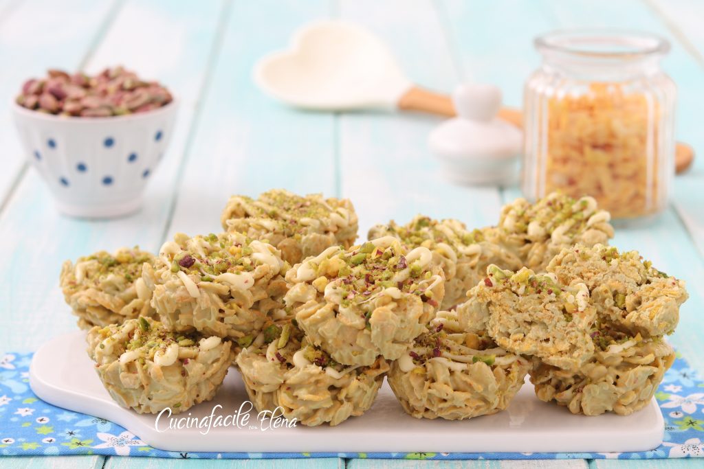 Les croquants au pistache sont des desserts sans cuisson délicieux, qui se préparent en 5 minutes avec seulement 3 ingrédients : cornflakes, crème de pistache et chocolat blanc. Je les ai appelés ainsi car ce sont des petites douceurs croquantes et délicieuses, parfaites en fin de repas, au petit déjeuner ou au goûter, idéales aussi pour les fêtes de Noël, avec un plateau de ceux-ci vous ne vous tromperez sûrement pas, zéro stress et 100% gourmandise, vous pouvez aussi les préparer à l’avance car ils se conservent longtemps et sont parfaits également pour offrir !