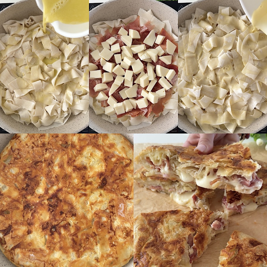 • Ajoutez le speck et le fromage en petits morceaux et recouvrez la garniture avec le second rouleau de pâte filo, coupé en bandes. Versez dessus le reste de la préparation, couvrez avec un couvercle et faites cuire la focaccia filo à la poêle pendant 10/12 minutes, à feu moyen-doux, retournez-la comme une omelette et continuez la cuisson pendant encore 8/10 minutes, elle doit être bien dorée.