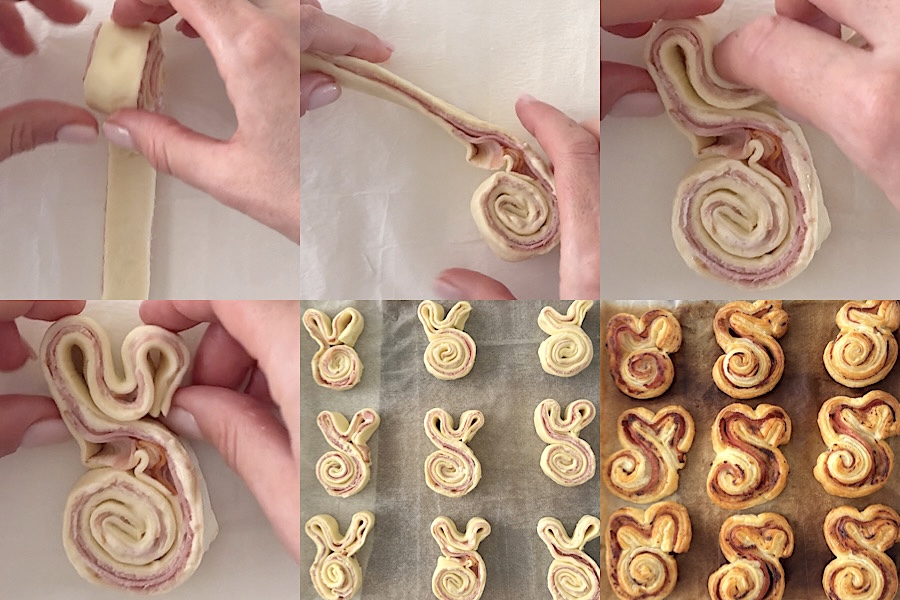 Les lapins salés en pâte feuilletée sont une entrée de Pâques très facile, rapide, gourmande et originale. L’année dernière, j’avais préparé les lapins feuilletés sucrés avec du Nutella, et pour cette Pâques, j’ai pensé les préparer en version salée, en changeant un peu la forme. Que c’est bon! Les lapins salés en pâte feuilletée se préparent en moins de 10 minutes avec seulement 3 ingrédients, vous pouvez les garnir avec la farce que vous préférez, j’ai mis du jambon cuit et de la sauce tonnato, ils sont délicieux et si simples à faire que vous pourrez même les réaliser avec les plus petits, de plus, vous pourrez aussi les préparer à l’avance et les cuire juste avant de les servir!