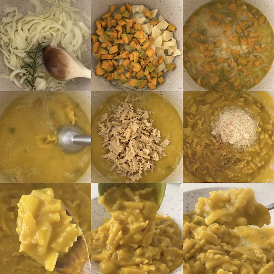 À la fin de la cuisson, éteignez le feu et assaisonnez les pâtes pommes de terre et potiron avec un peu de parmesan râpé, de poivre noir et de noix de muscade.