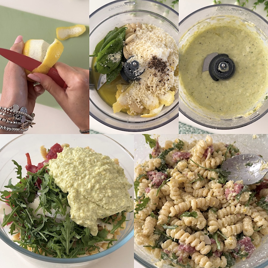 Les pâtes froides au citron avec bresaola, roquette et parmesan en copeaux sont très simples et rapides à préparer, pour commencer, préparez le pesto de citrons en mixant tous les ingrédients indiqués dans la recette, trouvez la procédure complète en cliquant ICI.
