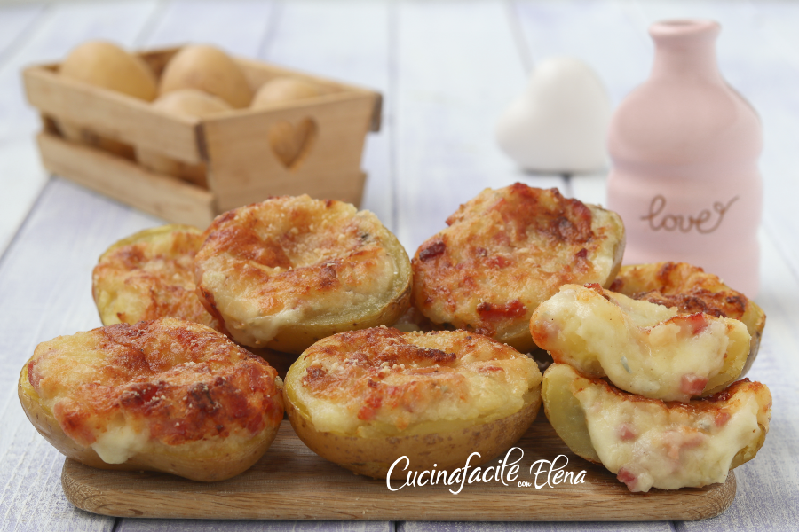 Les pommes de terre farcies au four avec gorgonzola, speck et scamorza sont une recette facile, délicieuse et super savoureuse. J’ai préparé ce plat pour le dîner et il a été très apprécié, il a disparu en un éclair ! Les pommes de terre farcies au four sont crémeuses, filantes et super savoureuses, parfaites comme plat principal mais aussi comme entrée, vous pouvez les personnaliser avec la farce que vous préférez (jambon cuit ou autres charcuteries, même végétariennes avec des champignons ou d’autres légumes), elles plairont à toute la famille !