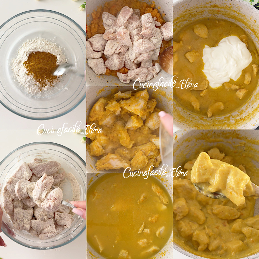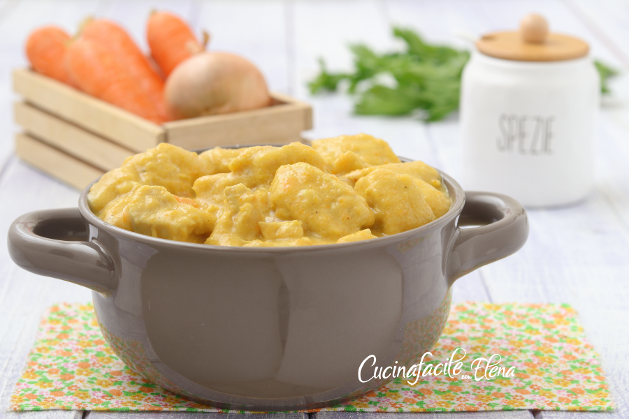 Le ragoût au curry est un plat de viande facile et délicieux, aux saveurs épicées. J’avais de la poitrine de poulet à cuisiner mais je n’avais pas envie de faire la classique escalope grillée ou panée, alors j’ai pensé à la cuisiner à la casserole avec des légumes et à ajouter le curry, une épice que j’adore. Dire qu’il a eu un succès fou est peu dire, il a aussi beaucoup plu à Matilde! Très tendre et avec une sauce très crémeuse grâce aussi à l’ajout d’un ingrédient secret, qui le rendra spécial, ce ragoût au curry est une recette que vous devez essayer au plus vite. Il est parfait à servir seul, accompagné de quelques tranches de pain (obligatoire pour faire la «sauce» :D) et d’une salade, ou avec du riz cuit al dente, le basmati est parfait!