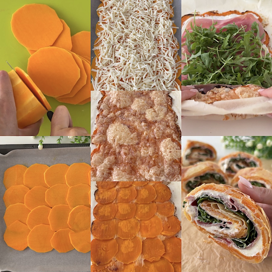 • En vous aidant avec le papier cuisson en dessous, formez un rouleau bien serré, coupez le rouleau de courge et savourez-le dans toute sa bonté.