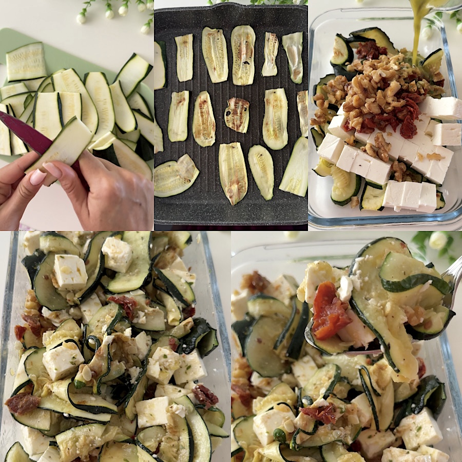 Mettez les courgettes dans un plat et ajoutez un peu de sel, puis ajoutez la feta coupée en cubes, la tomate séchée en morceaux, les cerneaux de noix grossièrement hachés et l’émulsion préparée précédemment, remuez bien pour bien mélanger tous les ingrédients.