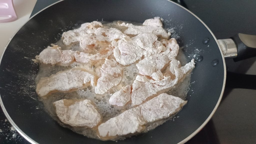 Pendant ce temps, couper la poitrine de poulet en lanières et l’enfariner.