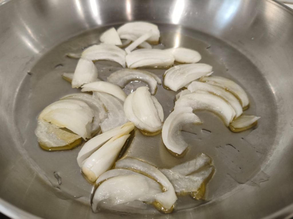 Émincez finement l’oignon et faites-le revenir dans une poêle avec un filet d’huile.