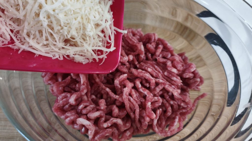 Dans un grand bol, mélange la viande, l’œuf, le fromage, la mie essorée, le persil et les épices. Travaille le tout jusqu’à obtenir une garniture homogène.
