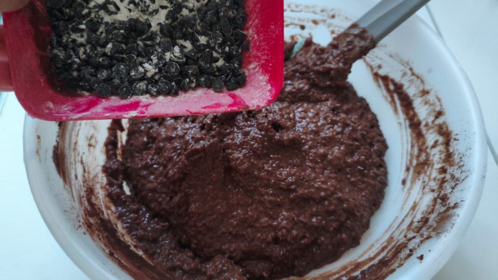 • Ajoutez les pépites légèrement farinées (ainsi elles ne couleront pas) et répartissez-les dans la pâte.