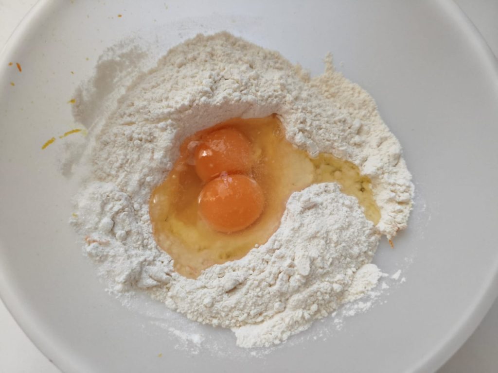 Ajoute les œufs puis pétris jusqu’à obtenir une pâte souple mais non collante. Ajoute les amandes entières et incorpore-les bien.
