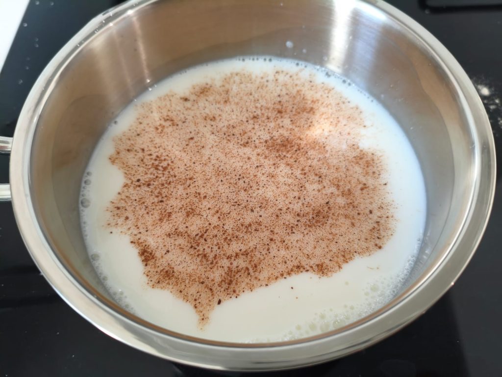 Verser le lait dans une autre casserole avec le sel et la noix de muscade et le faire chauffer.