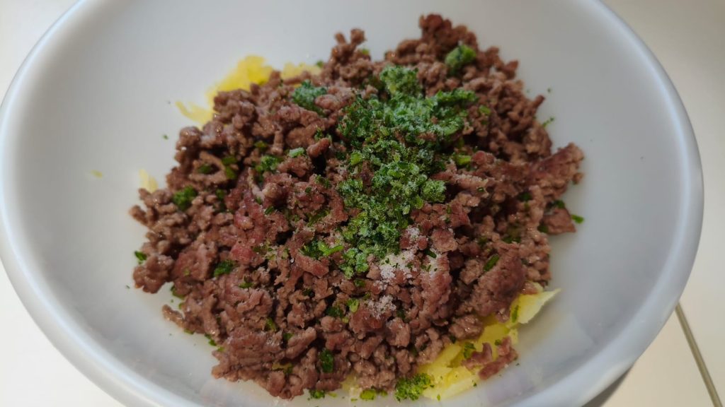 Préparer la farce, des choux de Savoie farcis faciles, en mélangeant dans un bol les pommes de terre, la viande, le fromage rùpé, le sel et le persil.