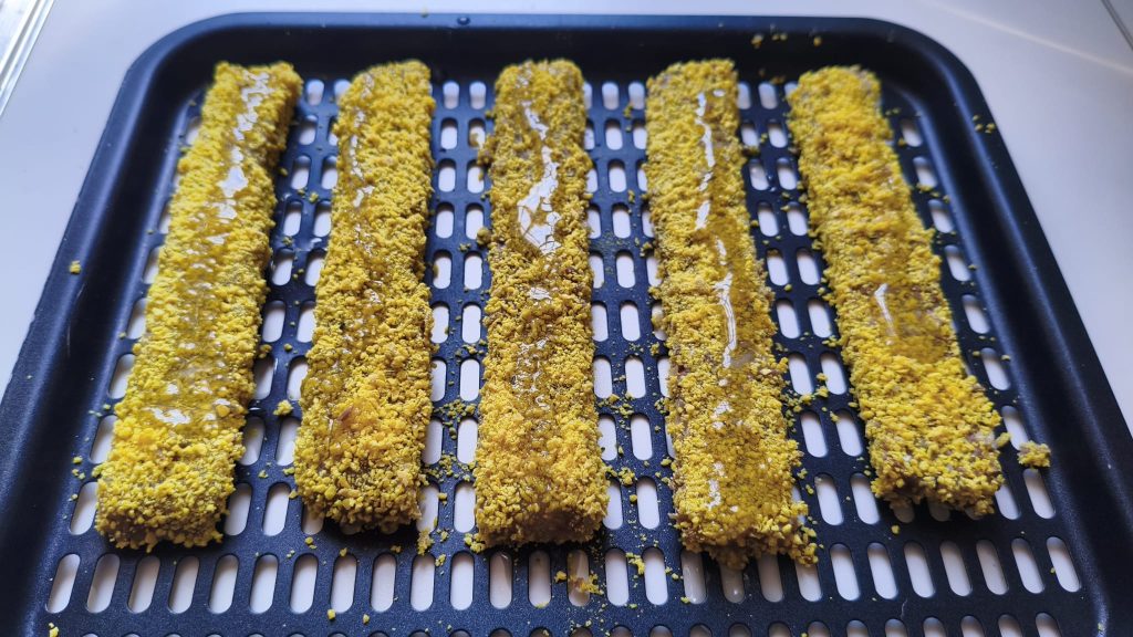 Panure extra croustillante : mélange chapelure + maïs grillé concassé.