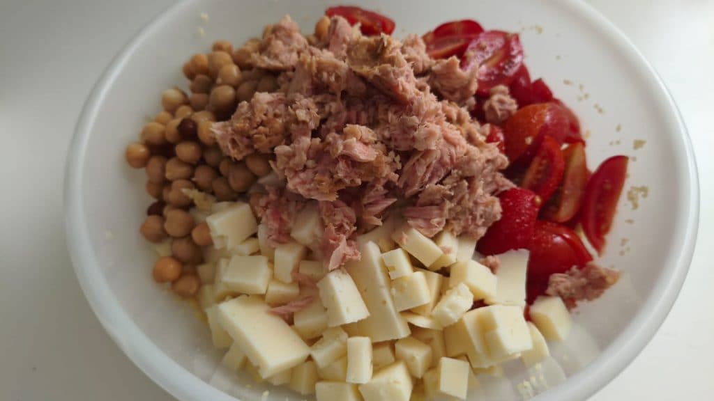 Ajouter au couscous les tomates cerises, l’asiago, les pois chiches, le thon, le zeste et le jus de citron et le basilic frais. Assaisonner de sel et d’un filet d’huile.