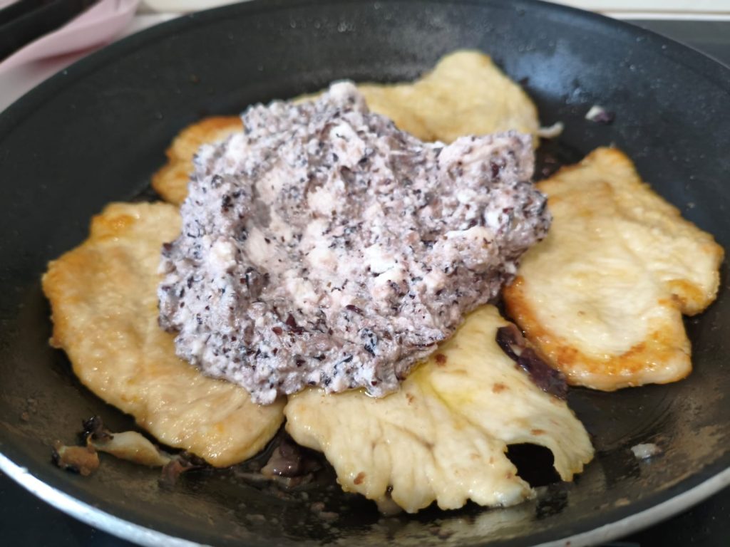 La préparation est très simple. J’ai utilisé des tranches de blanc de poulet, je les ai légèrement farinées et je les ai fait revenir dans une poêle avec un filet d’huile d’olive extra vierge. Quand elles étaient bien dorées, je les ai mises de côté. Dans la même poêle, j’ai ajouté le radicchio coupé en lanières et je l’ai fait cuire jusqu’à ce qu’il soit ramolli. Puis je l’ai mixé pour obtenir une crème de radicchio veloutée, et j’ai ajouté la ricotta pour la rendre encore plus crémeuse et délicate.