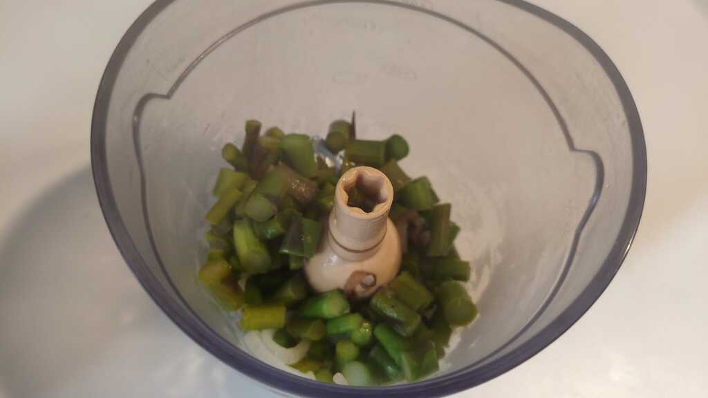 • Quand ils sont cuits, mettez la moitié des tiges cuites dans un hachoir avec deux tours d’huile et mixez.