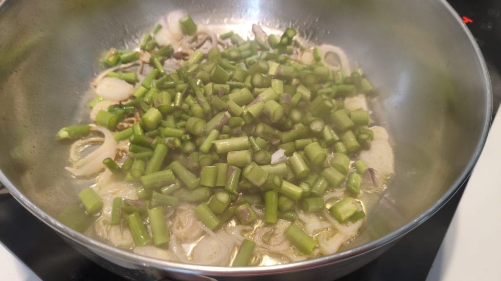 • Laissez cuire en ajoutant un verre d’eau ou de bouillon. À mi-cuisson, ajoutez également les pointes et salez. Cela prendra environ 5 minutes, le temps peut varier selon la taille des asperges, mais il suffira d’insérer les dents d’une fourchette dans un petit morceau d’asperge pour vérifier s’ils sont tendres.