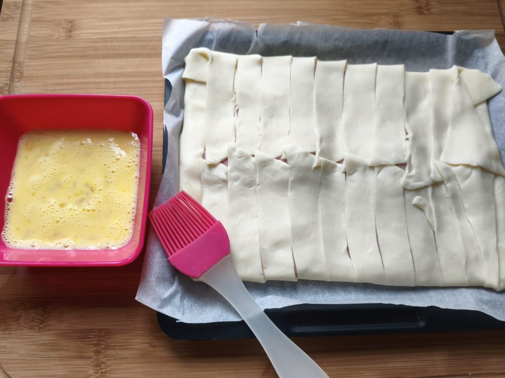 J’ai pris un rouleau de pâte feuilletée prête à l’emploi, je l’ai déroulé sur le plan et au centre, j’ai disposé des tranches de fromage Edam et de jambon cuit (j’ai utilisé celui pour toast, pratique et fin). Ensuite, j’ai refermé le feuilleté en pliant les extrémités sur la garniture, et j’ai découpé les côtés pour créer des bandes que j’ai superposées les unes sur les autres : un tressage simple qui rend le feuilleté plus joli et compact.