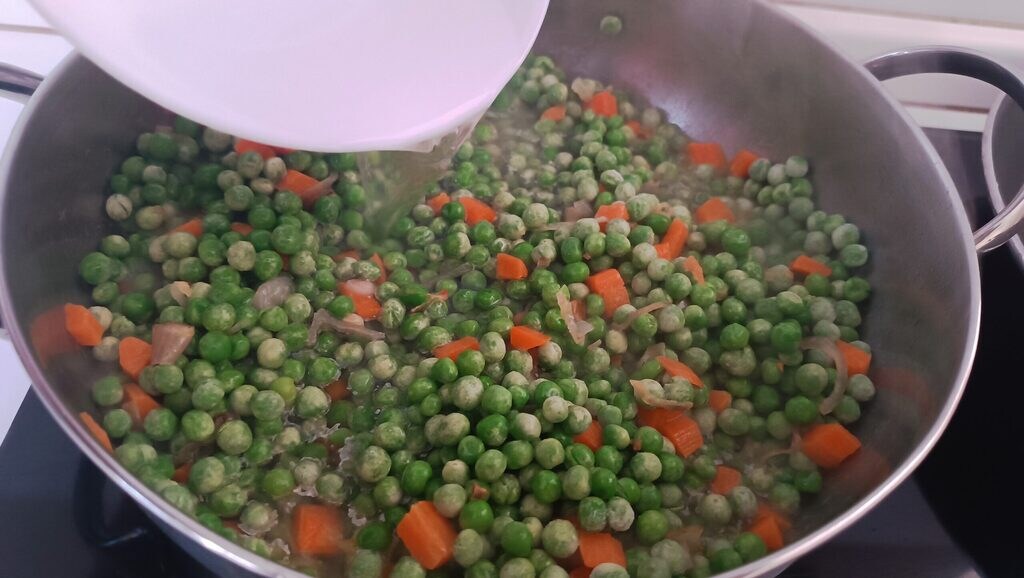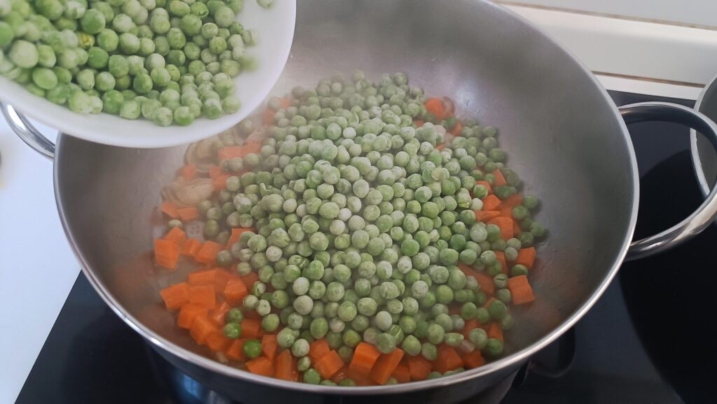 Ajouter les petits pois et cuire environ 5 minutes en remuant de temps en temps
