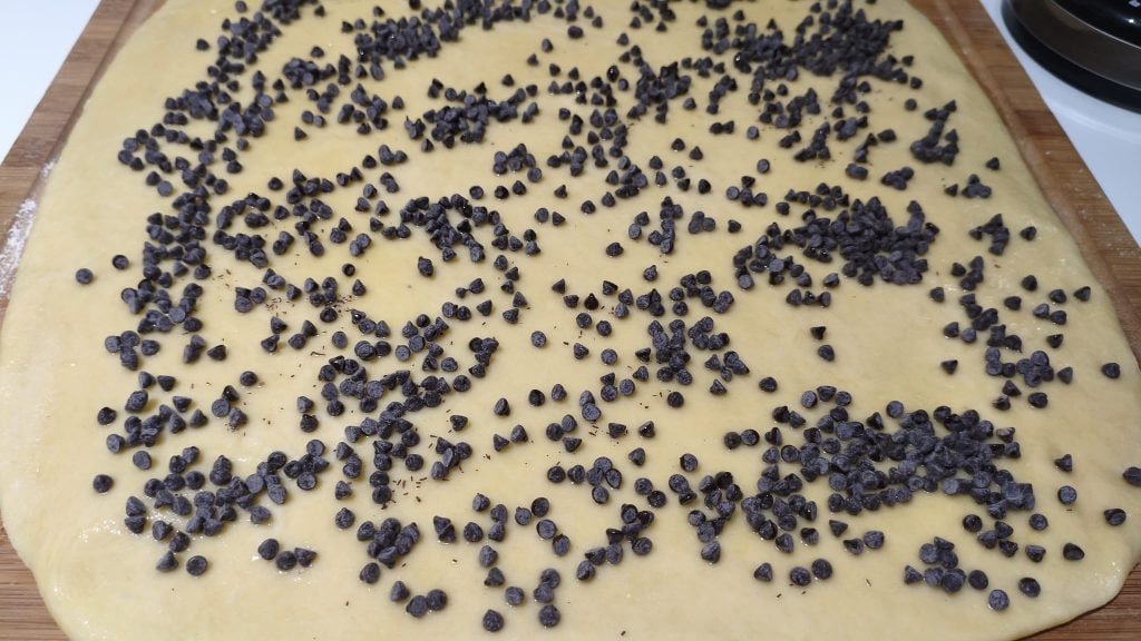 • Ajoutez les pépites de chocolat, ou à votre goût, de l’écorce d’orange confite ou des raisins secs, et roulez à partir du côté le plus long.