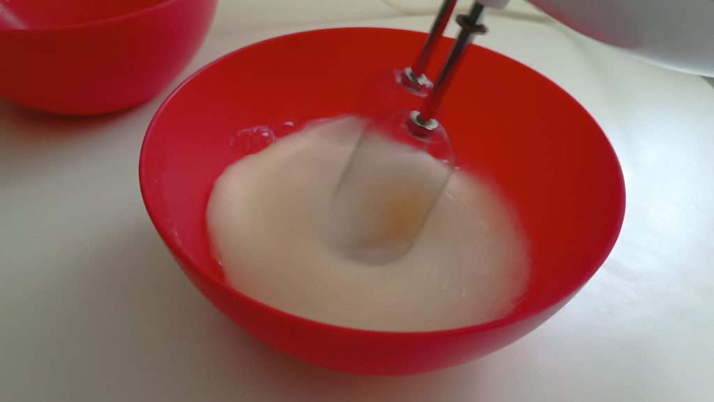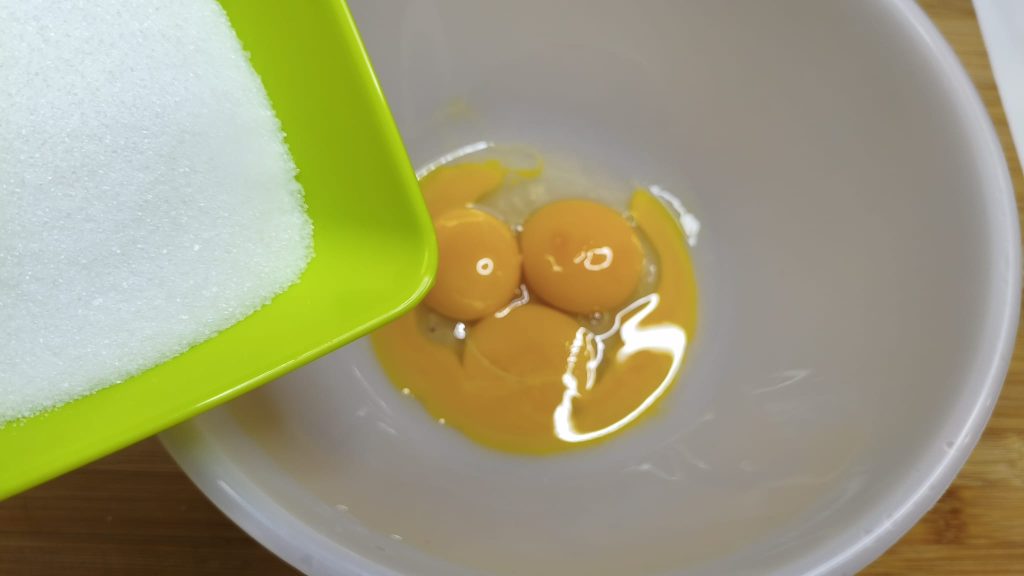 • Dans le bol des jaunes, ajouter le sucre et monter jusqu’à obtenir une crème claire et mousseuse