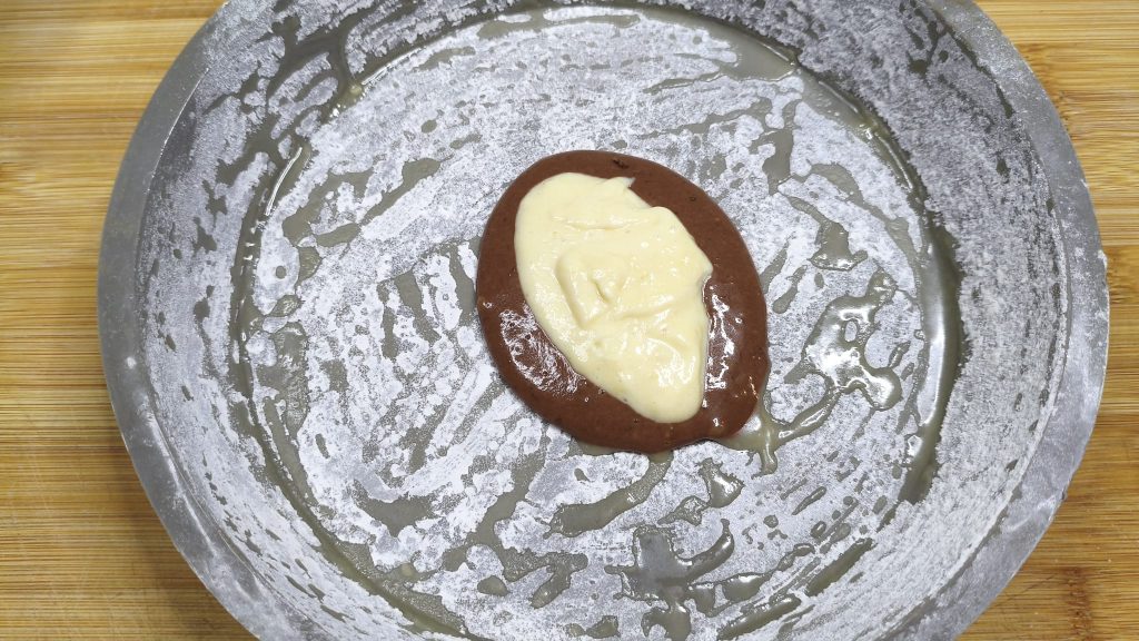 • Verser le mélange dans le moule, huilé et fariné, et à l’aide d’une cuillère, alterner pâte claire et pâte sombre.
