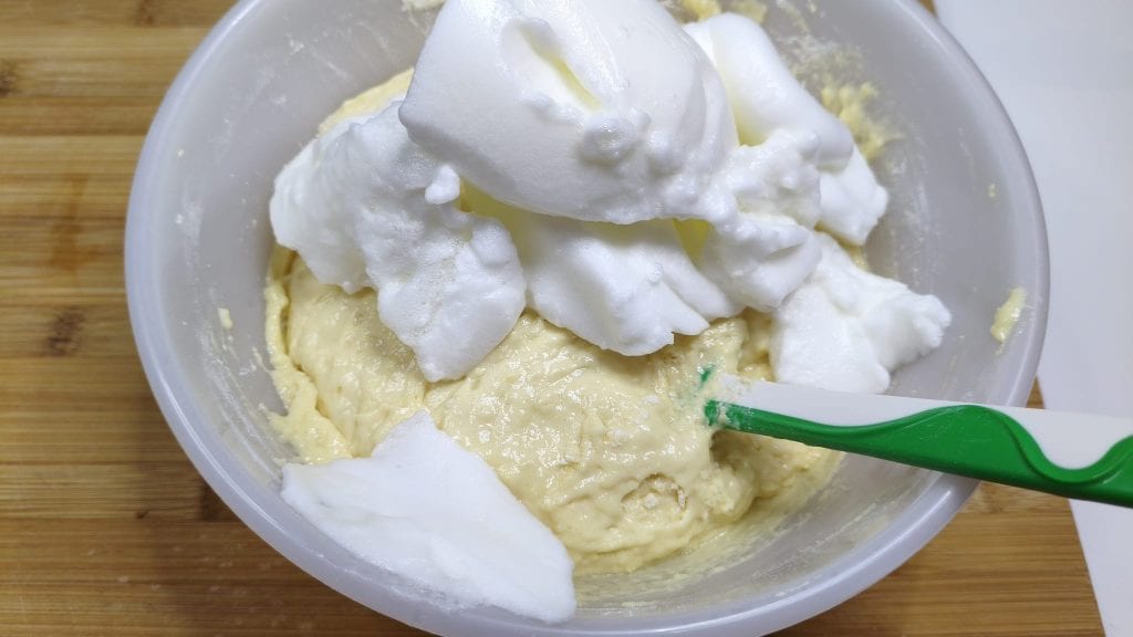 • Incorporer les blancs montés précédemment et mélanger de haut en bas pour ne pas les faire retomber.