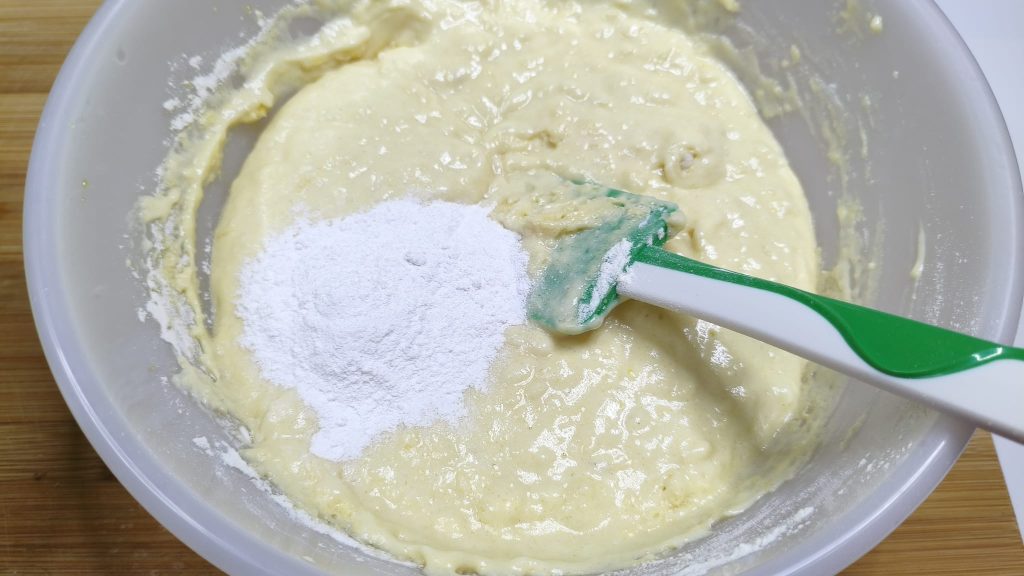 • Ajouter progressivement la farine et la levure au mélange et bien amalgamer pour éviter les grumeaux