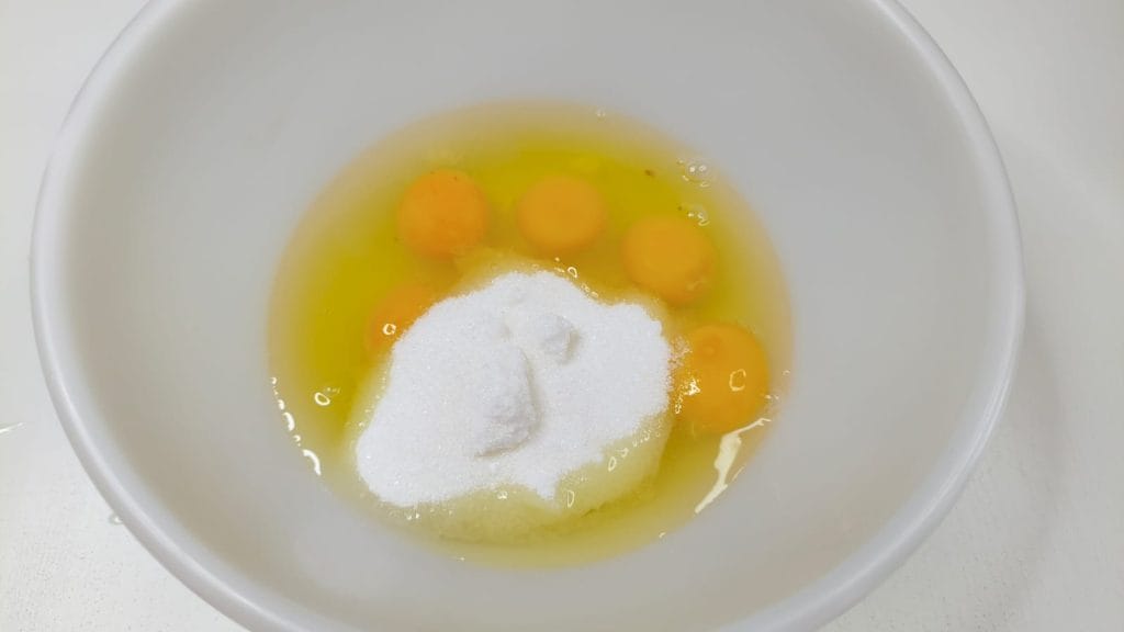 Pour préparer la génoise sans gluten, commencez par mettre dans un bol les œufs avec le sucre. Battez avec un batteur électrique pendant au moins 10 minutes jusqu’à obtenir un mélange clair, mousseux, et triplé de volume.