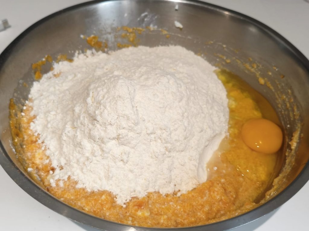 Ajoute la farine et l’œuf, en mélangeant jusqu’à obtenir une pâte douce mais travaillable. Si nécessaire, ajoute un peu plus de farine.