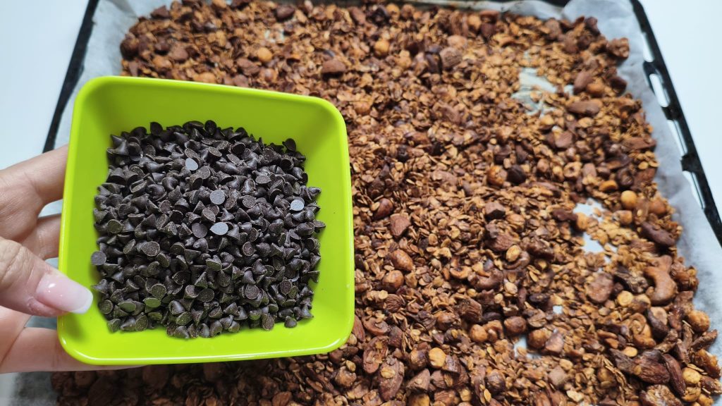 Laisse refroidir complètement puis ajoute les pépites de chocolat ou les fruits déshydratés.