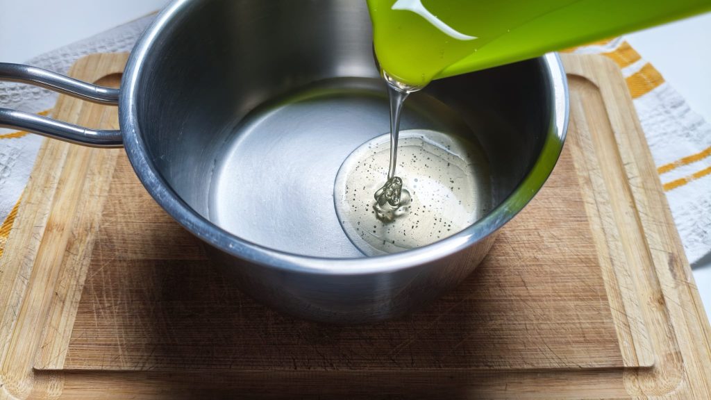 Dans une petite casserole, chauffe l’eau, le miel, l’huile (de tournesol ou de coco) et la vanille jusqu’à obtenir un mélange fluide.