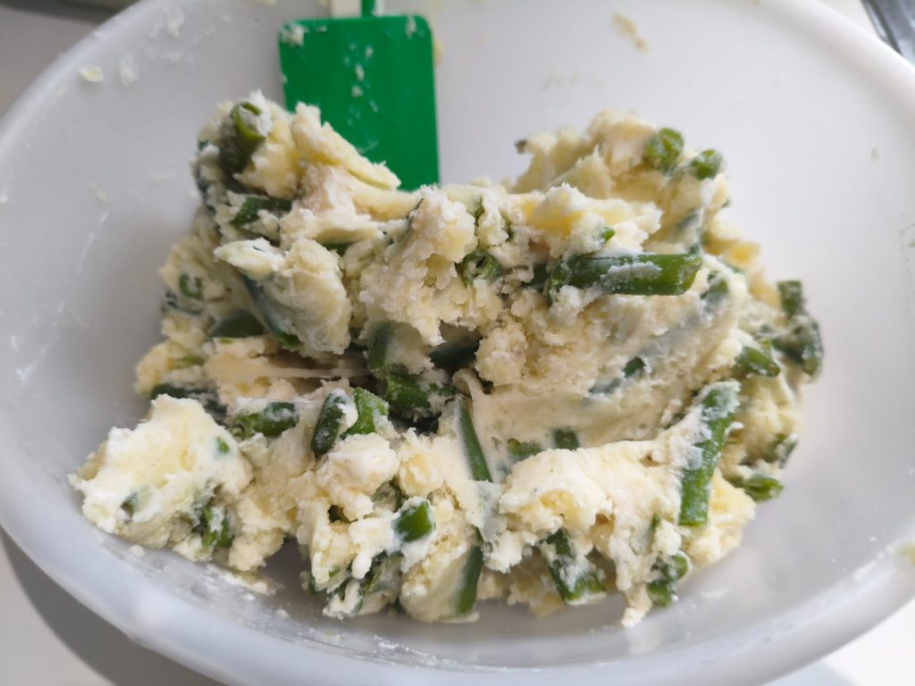 La préparation est vraiment simple : on fait cuire les pommes de terre et les haricots verts, on écrase les pommes de terre et on les mélange avec les haricots déjà cuits. J’ai ajouté de la ricotta crémeuse, une pincée de sel et des dès de scamorza pour rendre le tout plus fondant et savoureux. Ensuite, on huile un plat, on saupoudre d’un peu de chapelure et on verse le mélange. On lisse bien, on ajoute encore de la chapelure sur le dessus et hop au four !