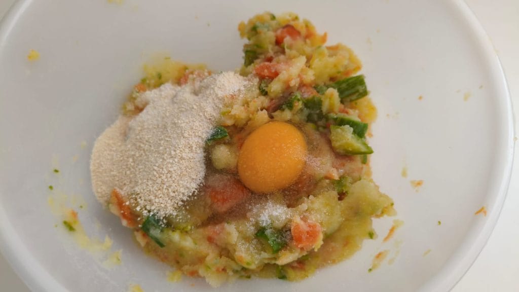 Une fois égouttés, les mettre dans un bol et les écraser à la fourchette. Ajouter l’œuf, le sel et la chapelure et bien mélanger.
