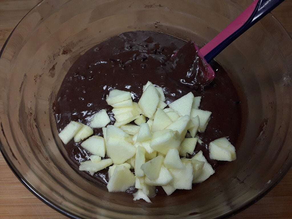 Ajouter à la pâte les pépites de chocolat, la levure et les pommes coupées en dés.