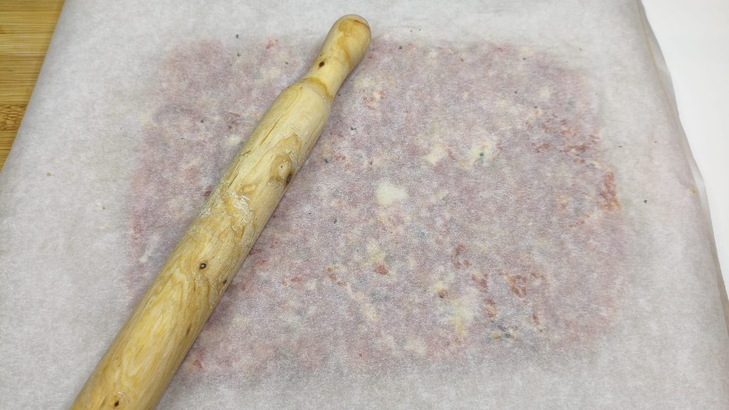 Recouvrir d’une autre feuille, étaler avec le rouleau à pâtisserie pour former un rectangle