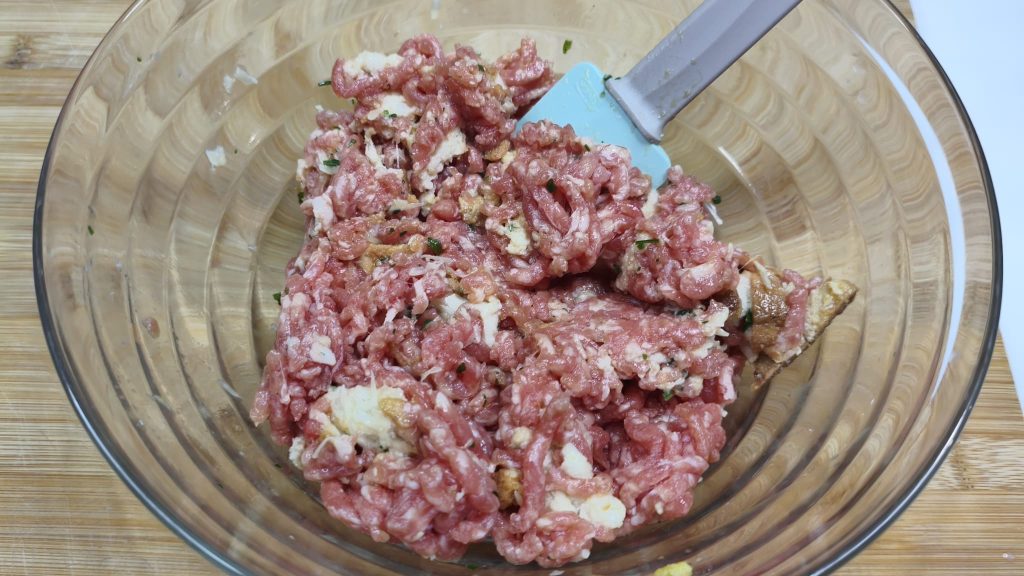 Presser le pain de mie et l’ajouter aux autres ingrédients.