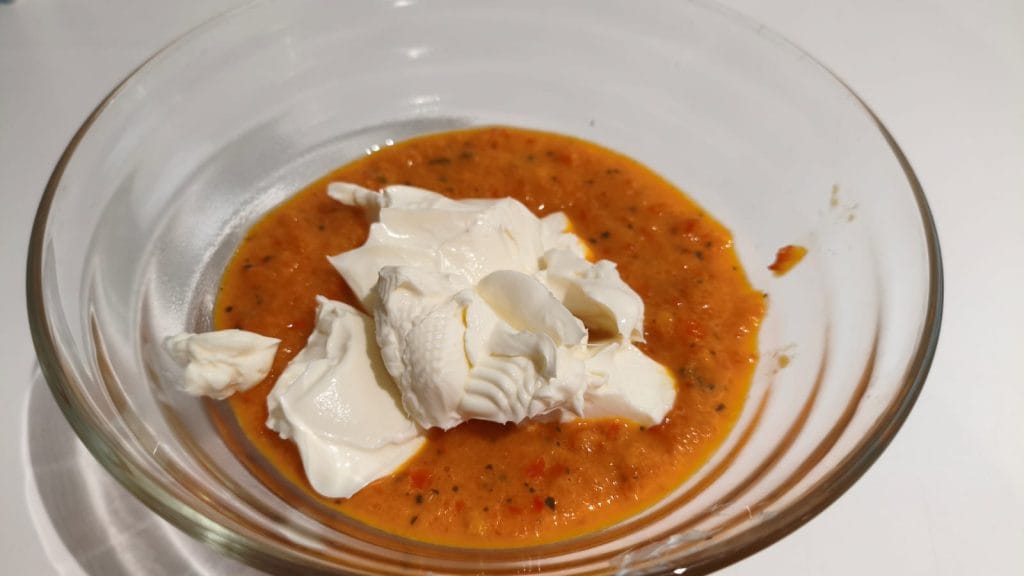 • Dans un bol, mélanger la crème de poivrons et la Philadelphia, bien mélanger.
