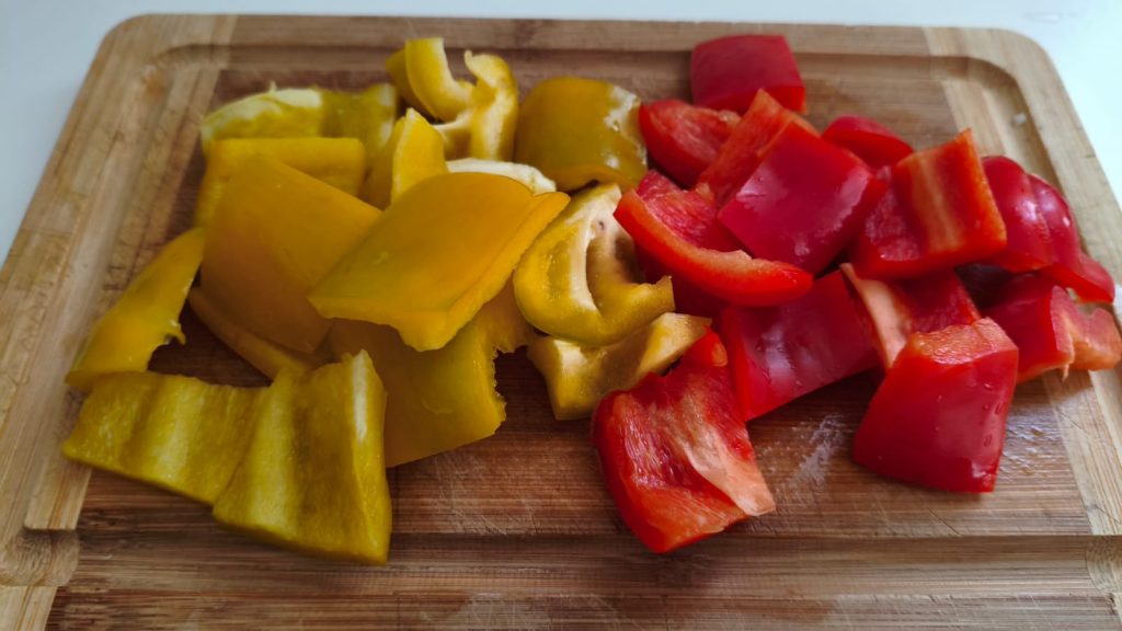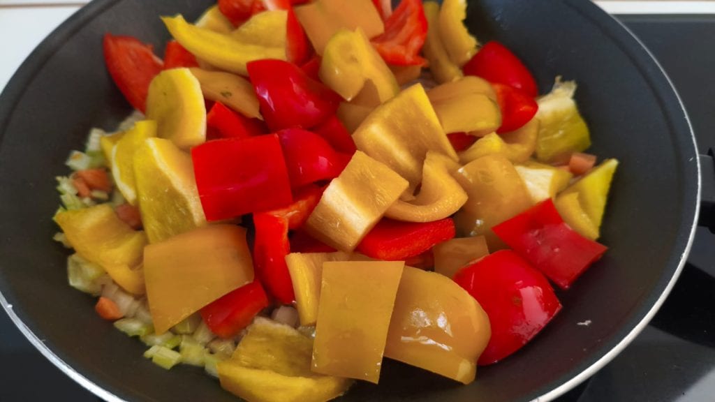 Ajoutez les poivrons coupés à la poêle et laissez cuire en ajoutant si nécessaire un demi-verre d’eau.
