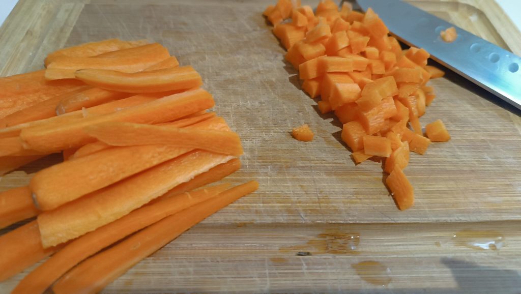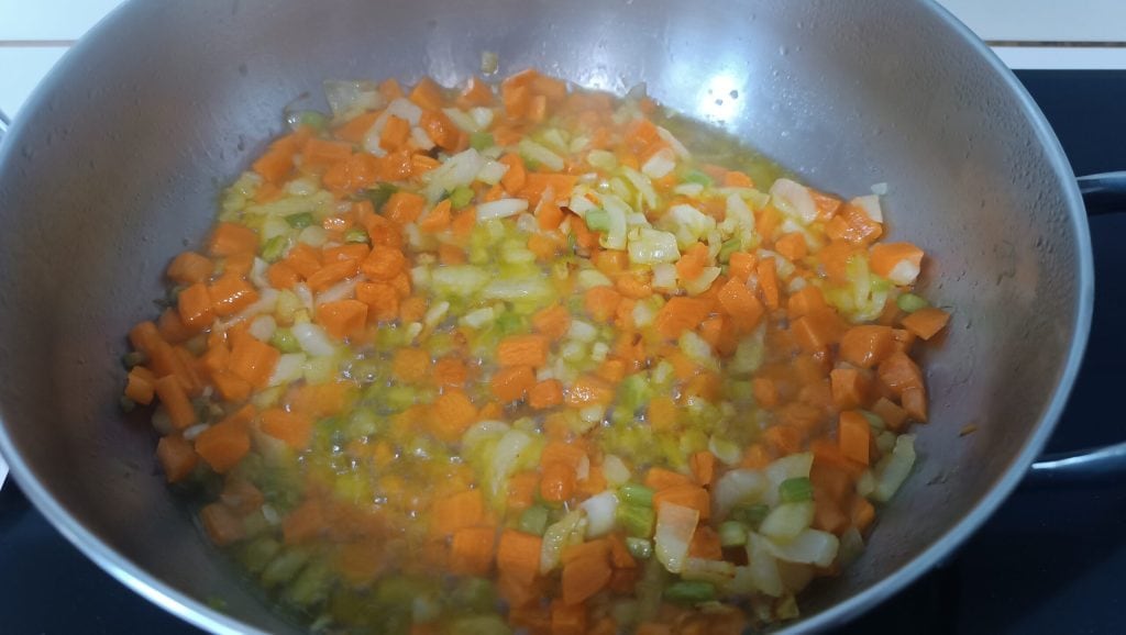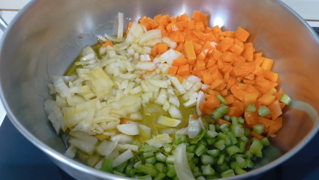 • Mettre dans une casserole avec deux tours d’huile les carottes, le céleri et l’oignon