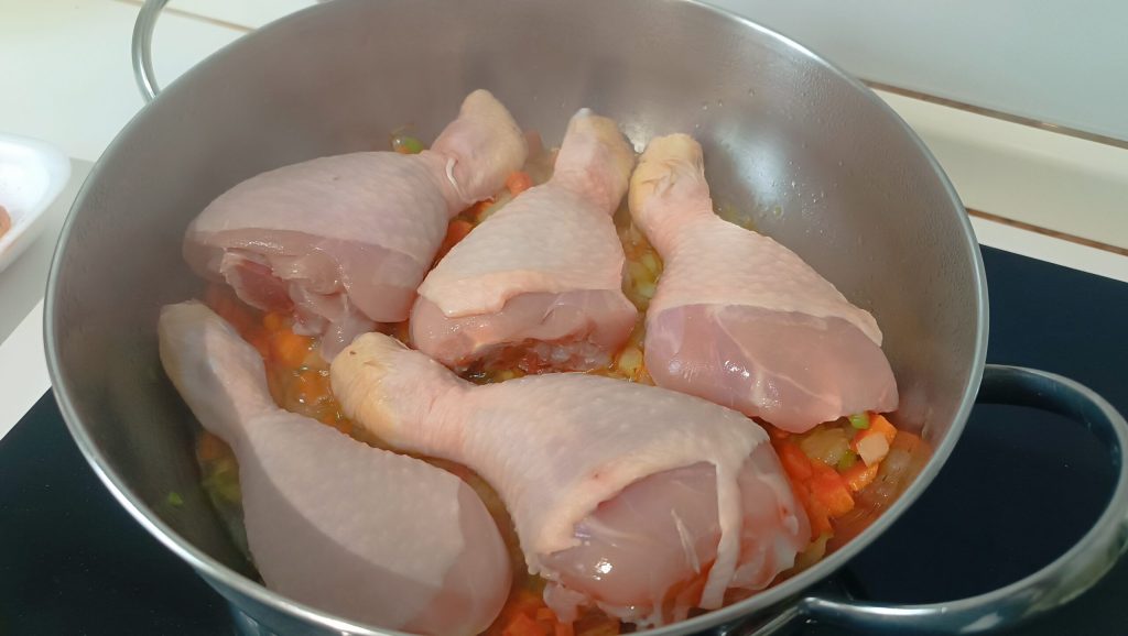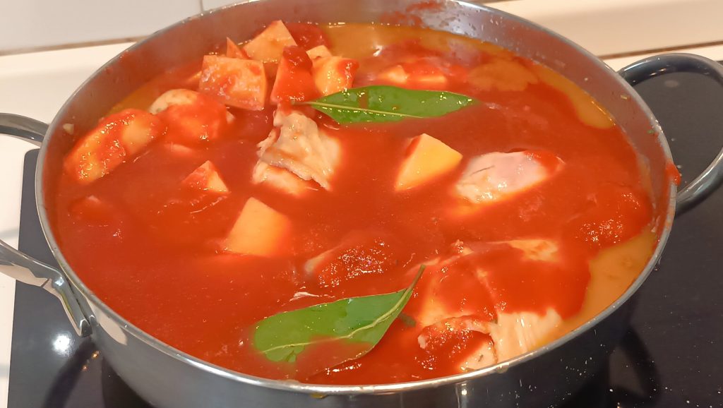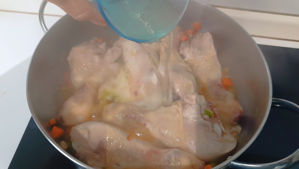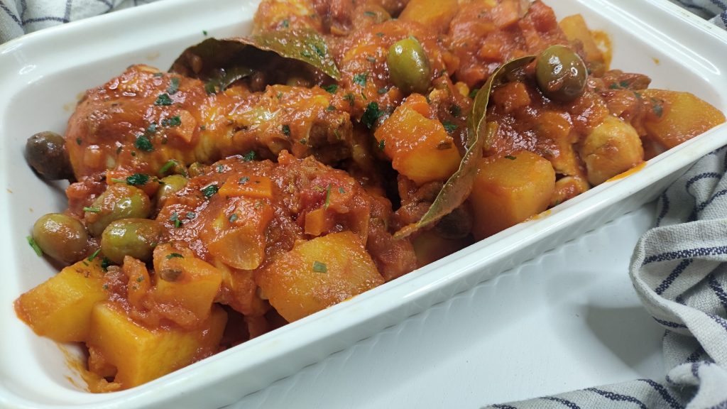 La touche finale est donnée par les pommes de terre coupées en morceaux, qui cuisent lentement avec le poulet, absorbant toutes les saveurs et les arômes.