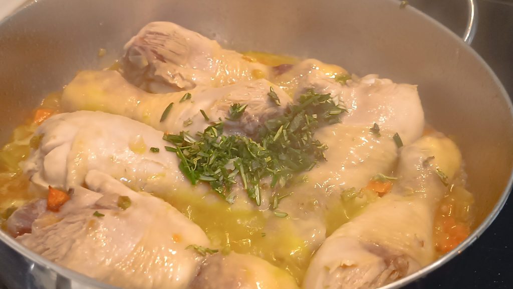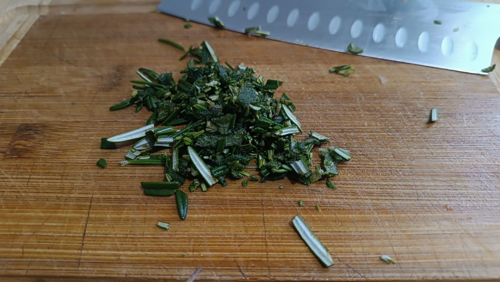 • Entre-temps hacher la sauge et le romarin et les ajouter au poulet