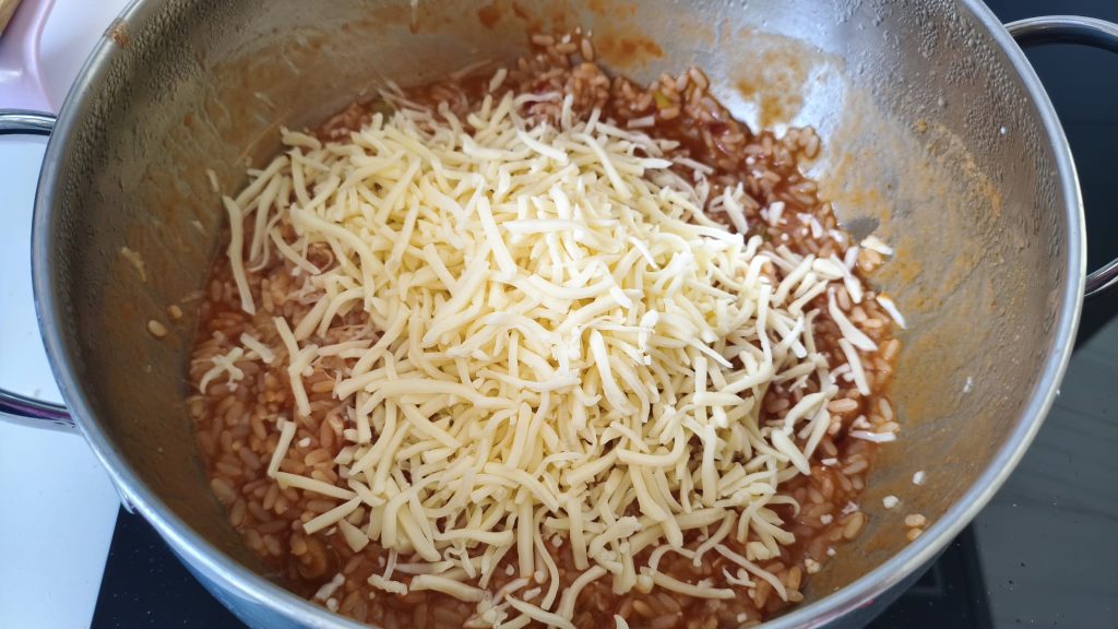 Quand le riz est presque cuit, ajoute la mozzarella et le parmesan. Mélange jusqu’à obtenir une texture bien filante.